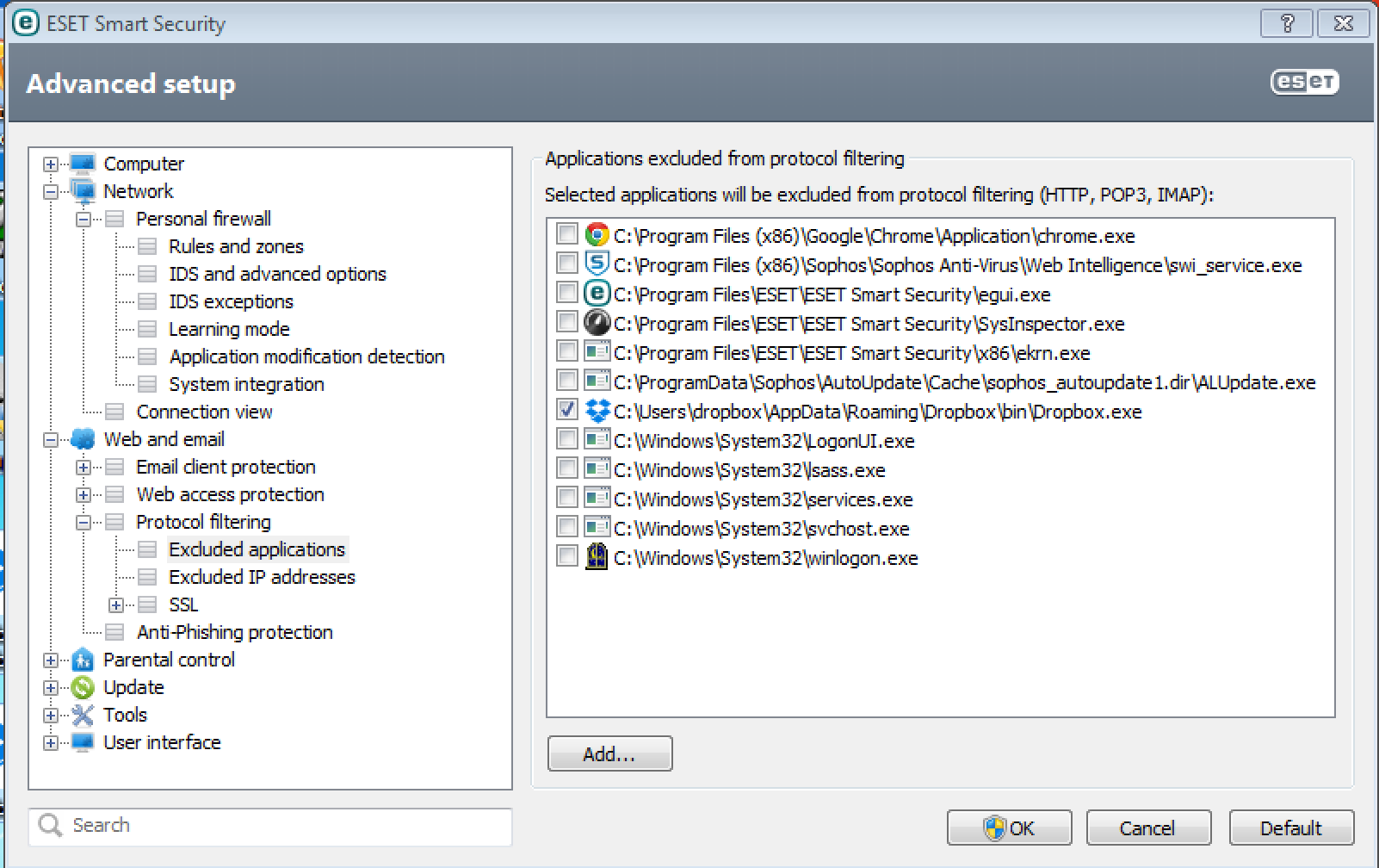 Known issues with ESET Endpoint Security Solutions: According to ESET's website, this product currently has a conflict with Dropbox when SSL scanning is enabled. Possible workarounds are to exclude the Dropbox certificate within the "Ask about non-visited sites" mode, as well as to exclude dropbox.exe from protocol filtering as shown here.