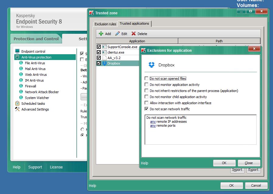 Known issues with Kaspersky Endpoint Security 8: This product currently has a conflict with Dropbox that prevent users from connecting after the application is updated. The current workaround is to add an exclusion in Kaspersky to allow Dropbox to connect. The second option is to upgrade the application to the Kaspersky Endpoint Security 10 version. More information on Kaspersky's site.