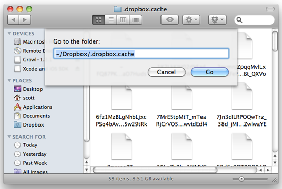 The Go to folder... dialog in the Mac OS X Finder - Recover your lost file by dragging it out of the Dropbox cache folder.