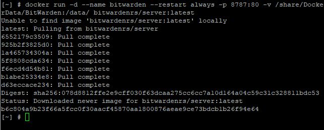 -v /share/DockerData/BitWarden:/data/ es la ruta persistente de los datos del docker. En el ejemplo es una carpeta BitWarden que está dentro un carpeta compartida llamada DockerData. Esto podemos cambiarlo según nuestras necesidades.