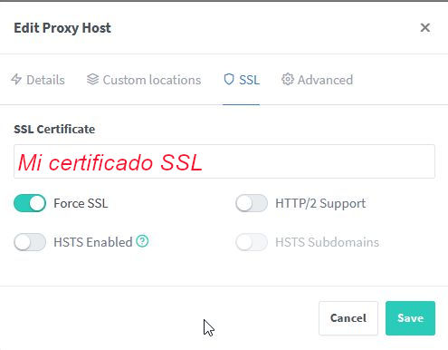 Para ello usaremos nuestra nginx proxy manager y definiremos una entrada en él, similar a la siguiente:
