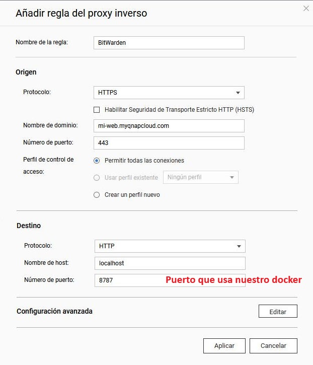 Al tener un nombre de dns tipo nombre_nas.myqnapcloud.com sólo podemos tener una única web accesible al exterior, la de BitWarden