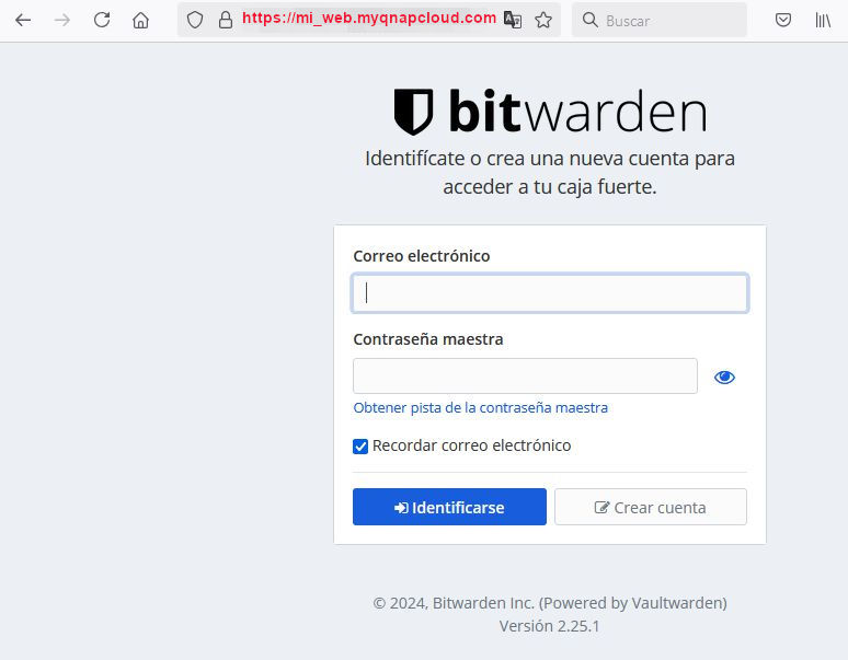 Pero una vez abierto ese puerto y si todo ha salido bien, cuando desde el exterior vamos a la web https://mi_web.myqnapcloud.com deberíamos ver la web de BitWarden