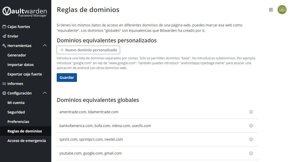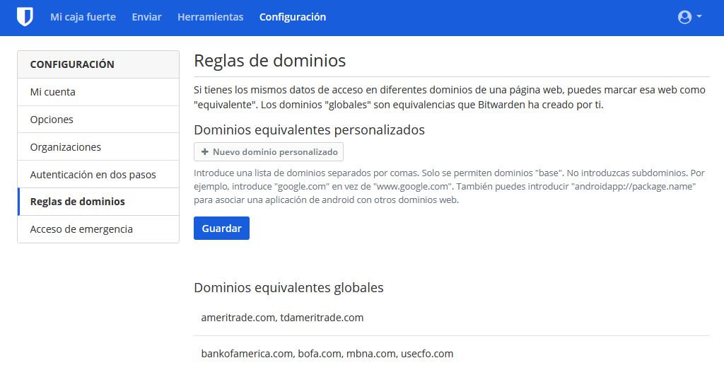 Pantalla de equivalencias entre dominios para que el programa se comporte igual en ellos