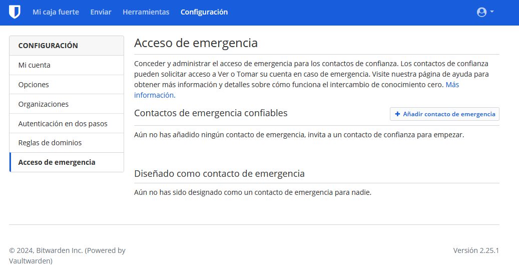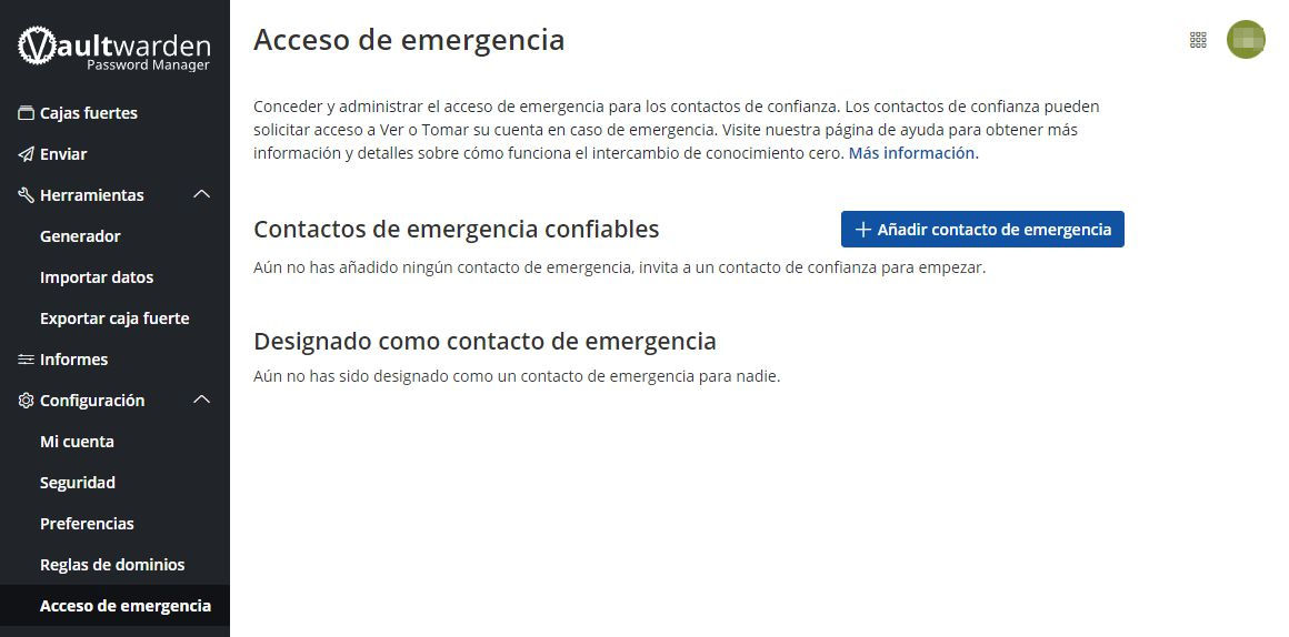 Pantalla de contactos de emergencia en caso de problemas para que puedan tomar control de nuestra cuenta