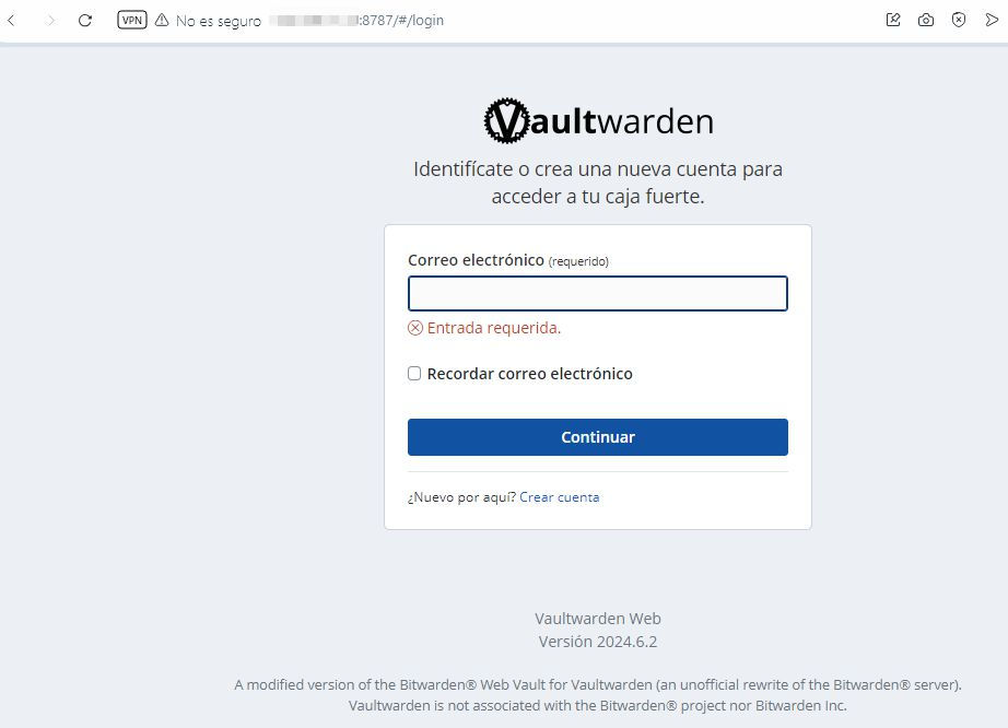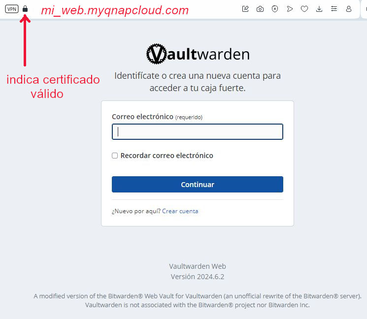 Pero una vez abierto ese puerto y si todo ha salido bien, cuando desde el exterior vamos a la web https://mi_web.myqnapcloud.com deberíamos ver la web de VaultWarden