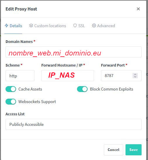 Ambos requisitos previos pueden ser cumplidos si tenemos por ejemplo un docker nginx proxy manager ya instalado y un nombre dns apuntando a nuestra NAS.