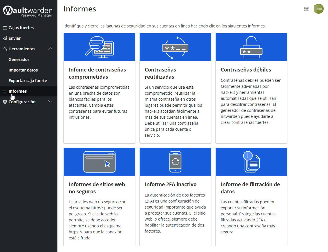 Esta pantalla nos genera distintos informes acerca de la calidad de nuestras claves, sus filtrados, estado del 2FA...