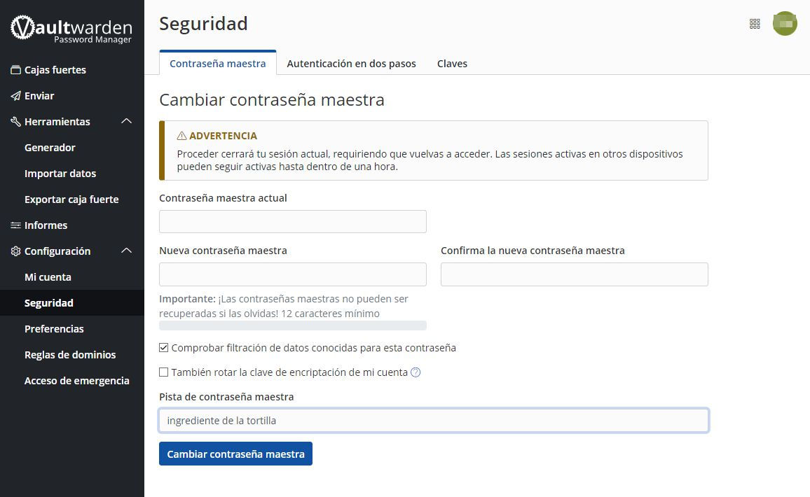 Esta es la lengüeta para cambiar la clave de acceso y la pista de la misma.