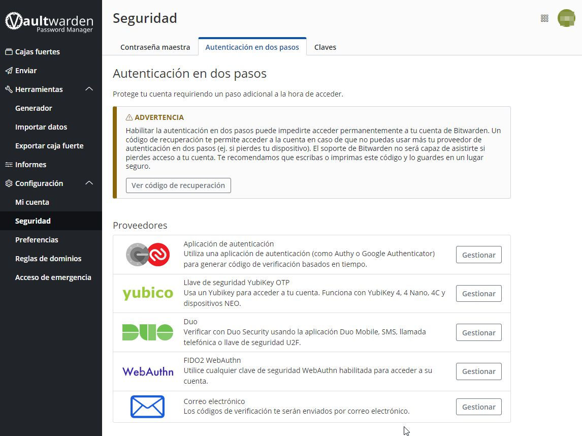 Desde esta lengüeta podemos activar distintos 2FA