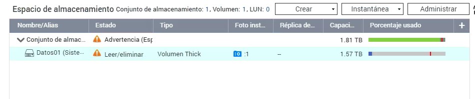 En uno de nuestros QNAP hemos recibido una alerta indicado que el volumen Thick está lleno por lo que solamente se puede leer/eliminar su contenido.