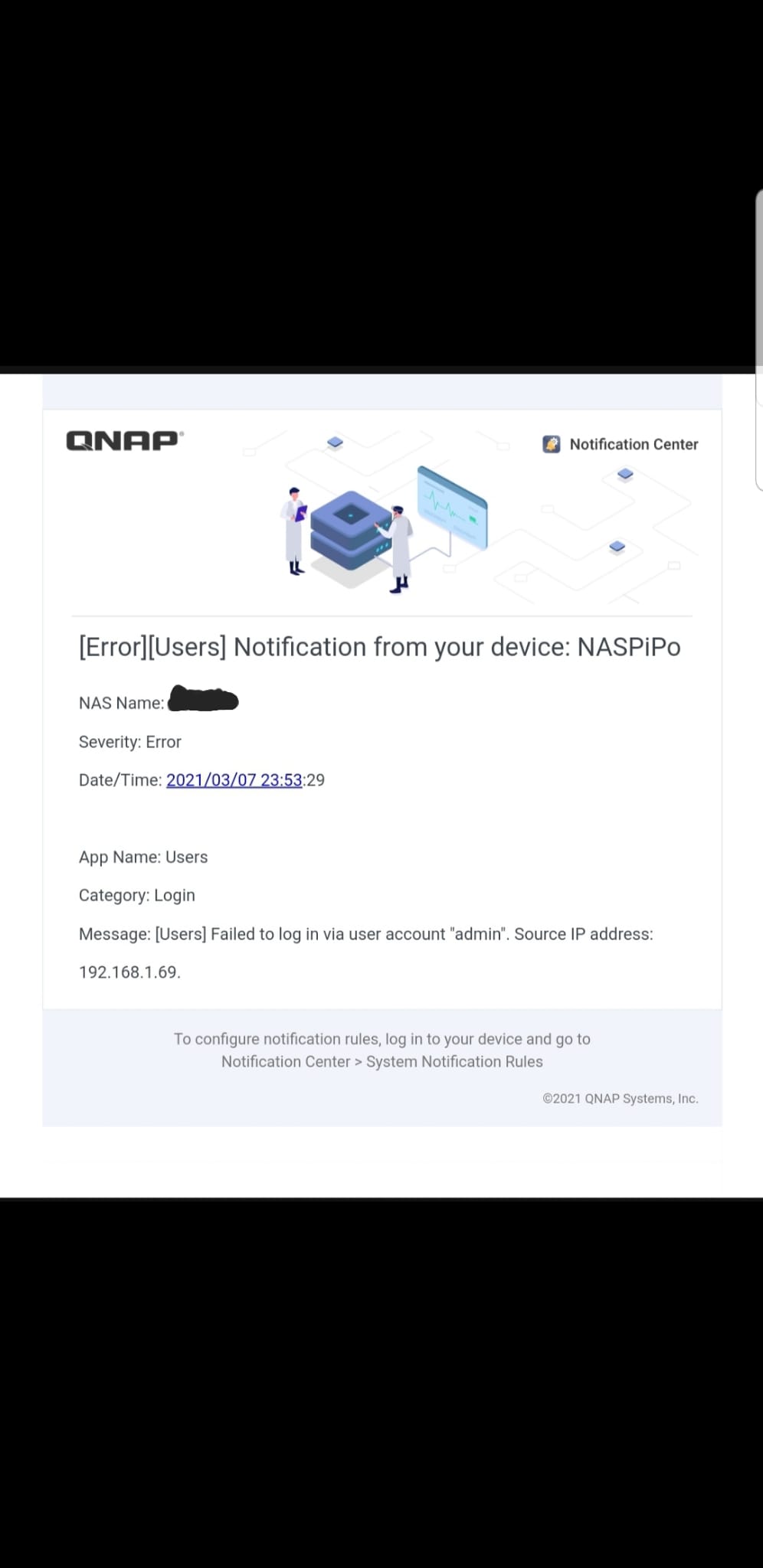 hola, estoy desesperado, no puedo iniciar sesion de qts desde ningun pc con windows desde casa ni ningun telefono, ayer me aviso de una nueva actualizacion y procedi a ello como siempre, tras la reiniciacion del sistema entro en qts sale la pantalla de bienvenida y meto user y contraseña despues de ello se queda la pantalla en azul y no hace nada mas, por red y ip veo las carpetas en la nas sin problemas ninguno como antes pero no en qts, tengo programado correos para algunas fallas y recibo el siguiente (meto una imagen del correo), mi miedo es perder todo, gracias de antemano. qnap TS-431P.