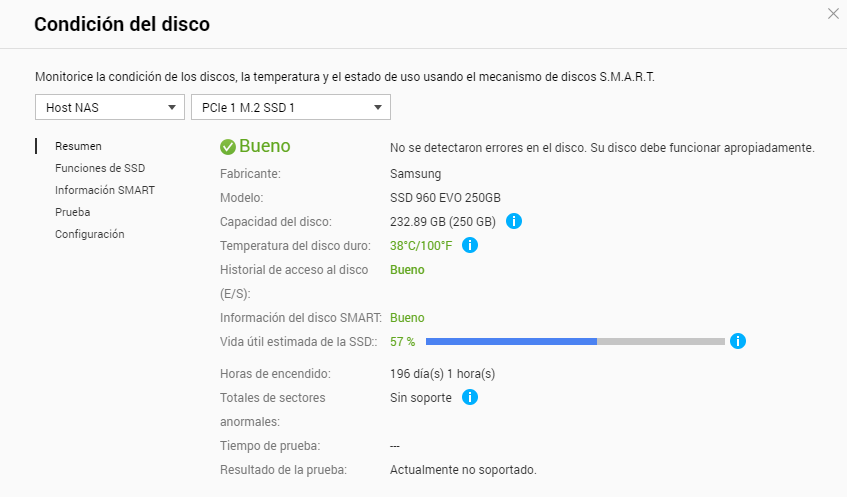Tengo una duda. Compré a finales de diciembre una tarjeta QM2 para aprovechar en mi NAS una unidad SSD NVMe a la que no le estaba dando uso en el ordenador. Cuando lo instalé revisé los datos que pone el NAS de esa unidad y en el apartado de "Vida útil estimada del SSD" me ponía 92% si no recuerdo mal.