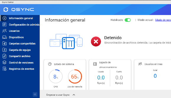 El tema ha venido cuando he ido a instalar Qsync Central para que los contactos estén sincronizados. No hay forma de iniciar el Qsync. Lanzo la aplicación en el NAS y en todo momento me informa que la sincronización de archivos está detenida: