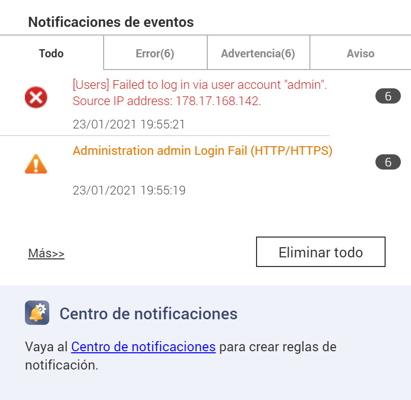 Desde hace varios meses me viene apareciendo una notificación en mi QTS la cual dice lo que veis en la captura de pantalla. A veces se tira días sin notificarme nada y otros días me aparece dicha notificación hasta 6 veces en un solo día. Sospecho que alguien está intentando acceder a mi NAS sin tener autorización. He chequeado la IP que aparece en internet y me dice que proviene de Moldavia.