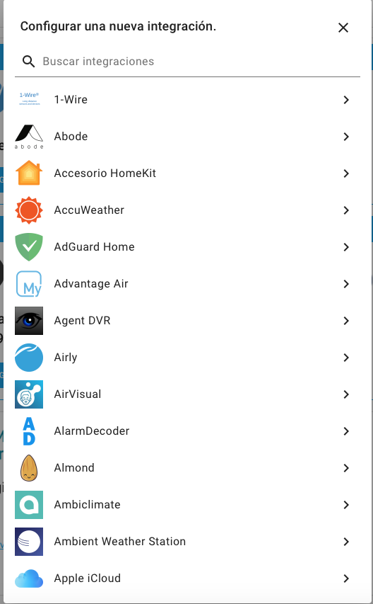 11. Para ir añadiendo elementos nuevos vamos a configuración y seleccionamos integraciones y pulsaremos sobre la tecla + para ir añadiendo mas, en esta pantalla tendremos los elementos que nos han detectado previamente en la instalación, podemos pasar a configurarlos y añadir nuevos