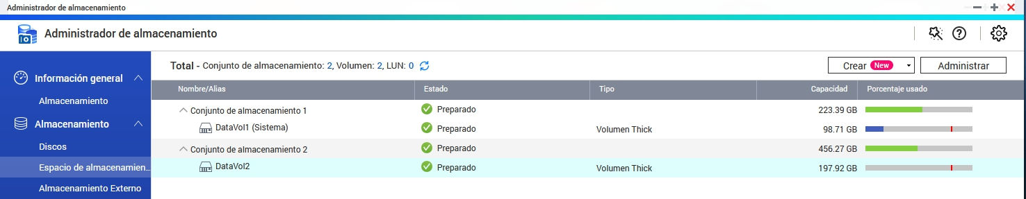 Dicho esto, he comenzado usando una nas con un sólo conjunto de almacenamiento "DataVol1" con un volumen de unos 100GB
