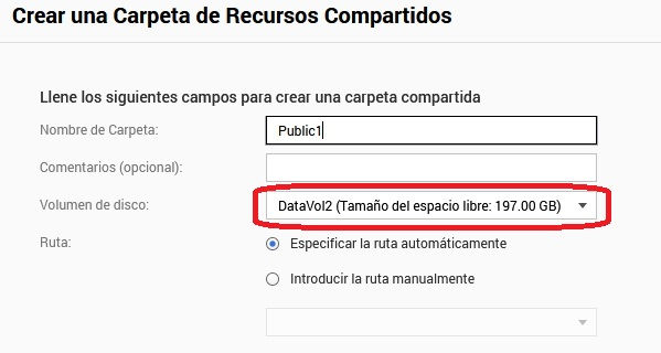 En la imagen siguiente se crea la carpeta "Comun" en DataVol2 pero su nombre compartido será "Comun_"