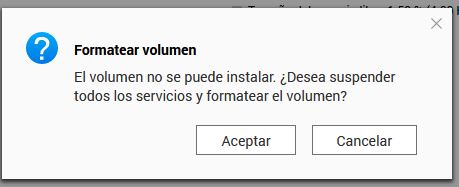 He intentado formatearlo, pero me marca el mensaje: El volumen no se puede instalar. ¿Desea suspender todos los servicio y formatear el volumen? Mi duda aquí es, si al mencionar que va a suspender todos los servicios, se refiere a los demás volúmenes también? (Agrego imagen con el mensaje)