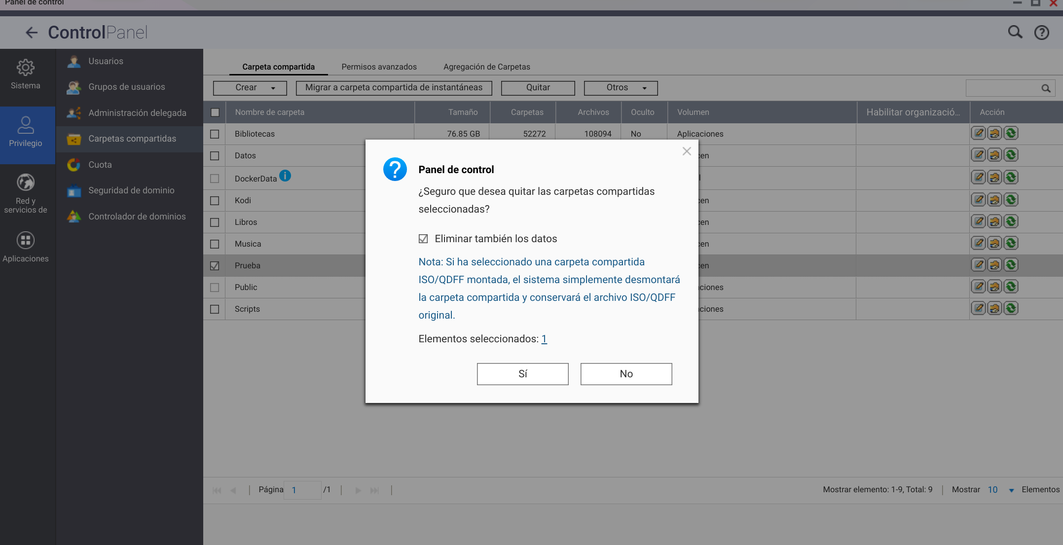 Marcamos Eliminar también los datos y esa carpeta compartida se eliminará.