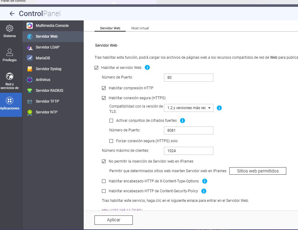 Como es un servicio web, ha de estar previamente activado el servidor web de la QNAP, tal como se ve en la la captura siguiente