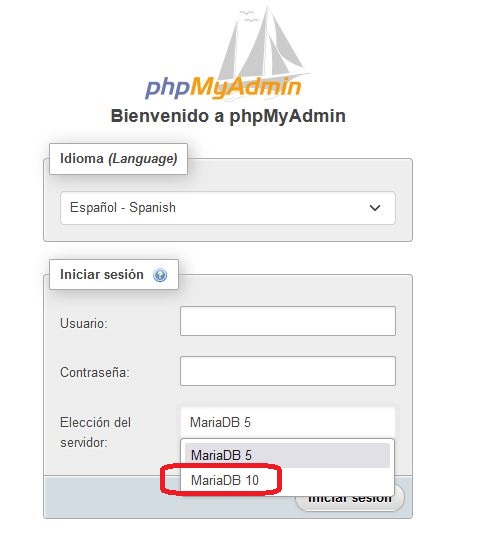 Cuando iniciemos PhpMyAdmin nos presentará el acceso a dos posibles motores de base de datos. La versión 10 y la 5.