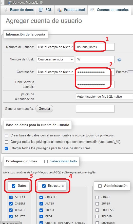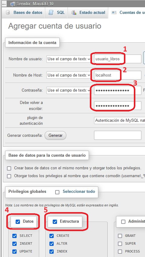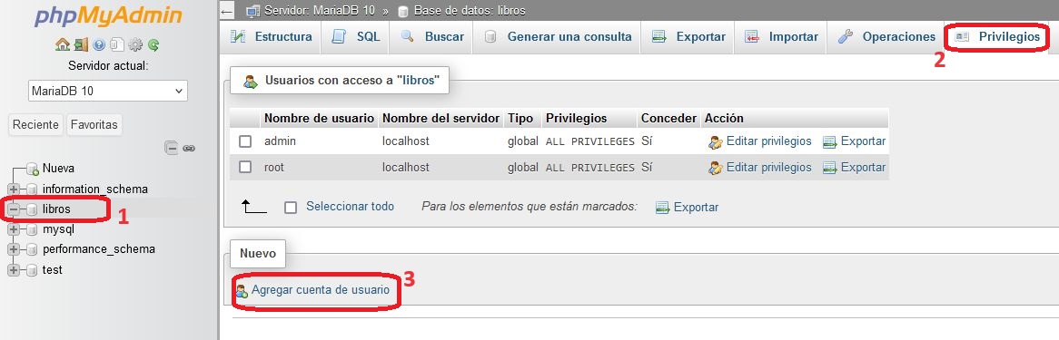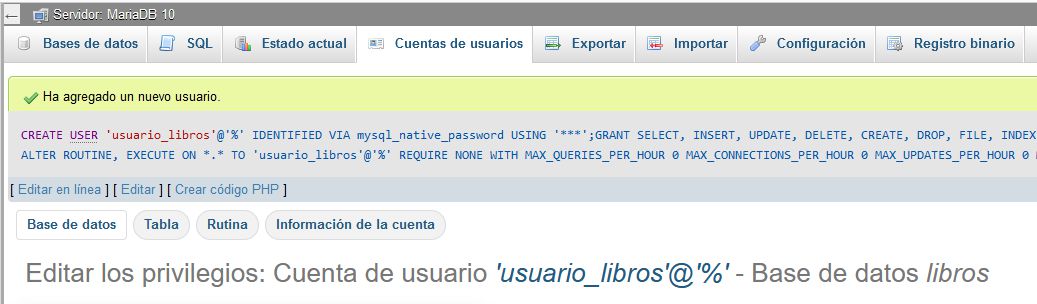 Por ejemplo vamos crear un usuario llamado "usuario_libros" en la base de datos de "libros".