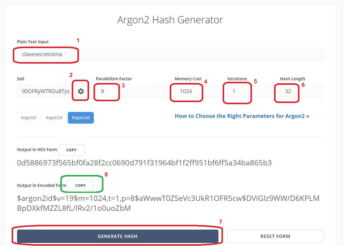 #Pulsamos en generate hash y nos debe dar algo asi en el campo outputin Encoded Form $argon2id$v=19$m=1024,t=1,p=8$NTEwNGFYVHNGNlo2OGxwOA$rPYzg2lYoNH7MQ5pv6m3isHCCcJYnf+1A/uIiMUrUhE