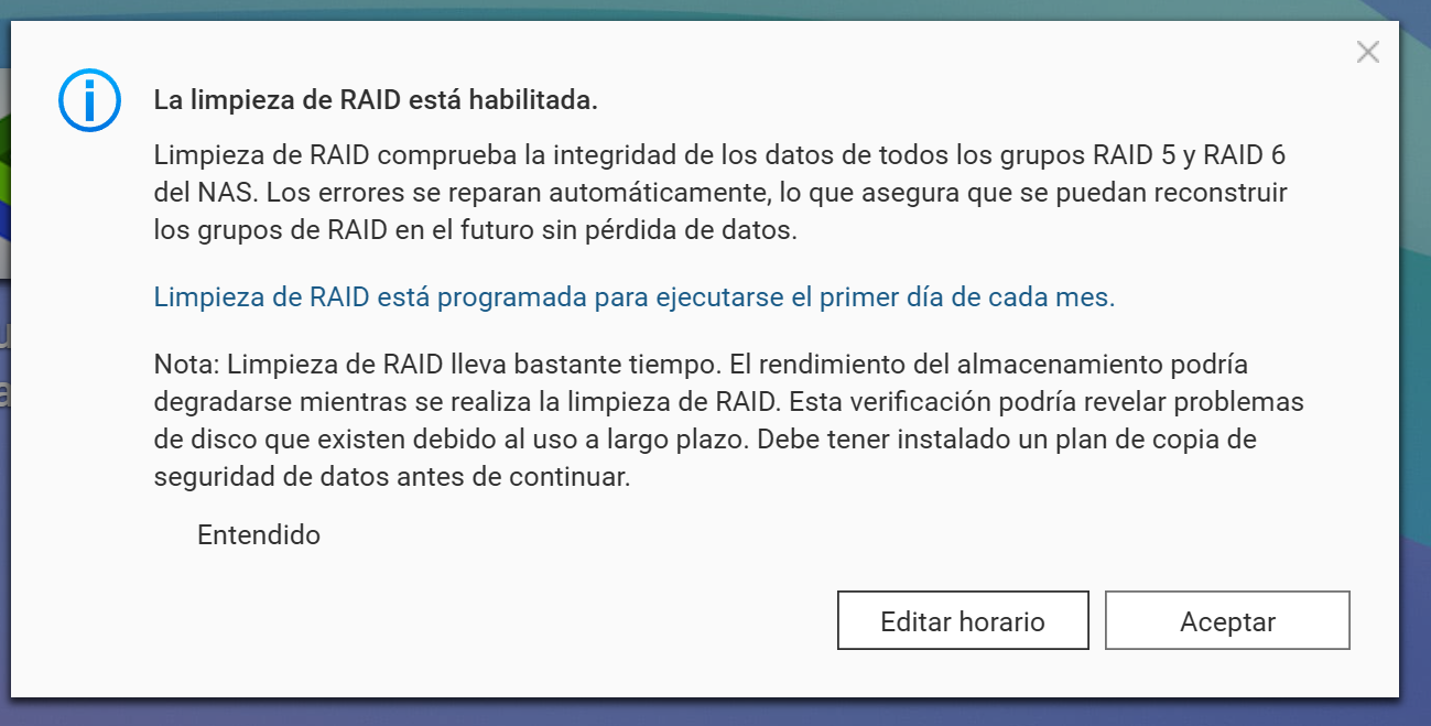 Bueno, ya configure mi ts664, dos mvme de 1TB para sistema (todo volumen) y aplicaciones en raid 1 y 6 hdd de 4TB en raid 5 para datos (todo volumen), he creado instantaneas en ambos volumenes dandole un 5% (tengo copia de seguridad de todo), bueno creoq que hasta ahi todo bien, se me plantean dos dudas, cuando inicio sesion me sale una cartel diciendo "la limpieza de raid esta habilitada" y que se ejecutara el primer dia de cada mes, esta bien, o es demasiado, se podria configurar para mas tiempo, tengo muchas dudas. Por otro lado al tener creados dos columenes en distintos almecenamiento, la carpeta multimedia me aparece en el grupo de los mvme y no tengo opcion a cambiarla al otro volumen me sale deshabilitada como podria cambiarla o eliminar esta y crear una nueva en el otro volumen que no me deja crearla. Gracias.