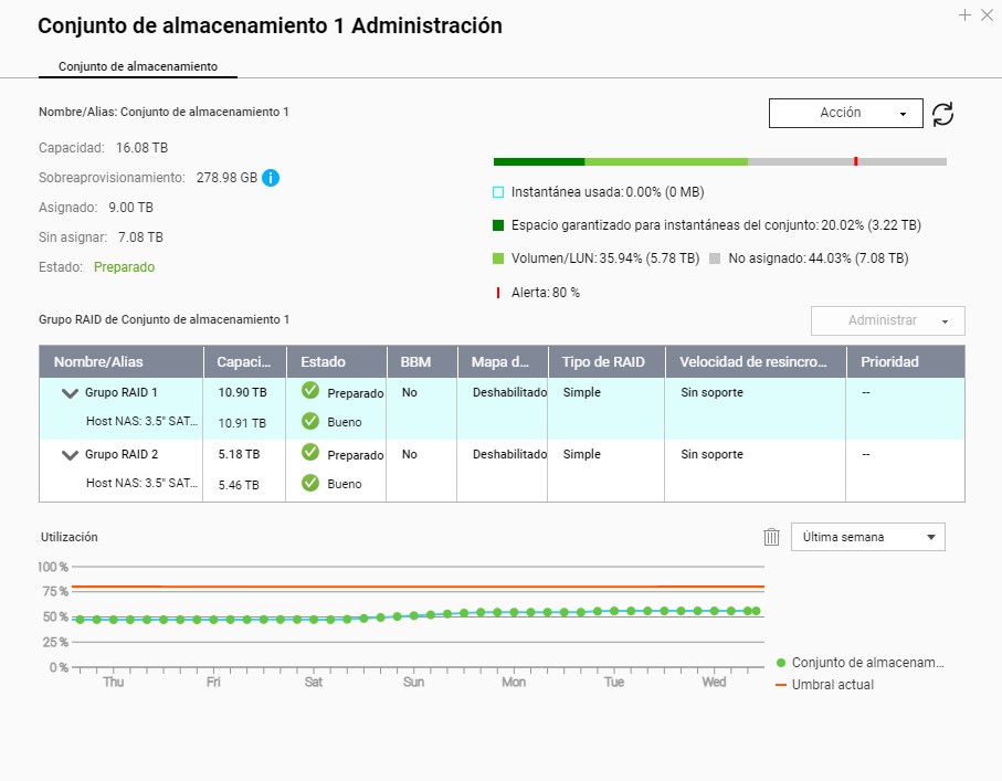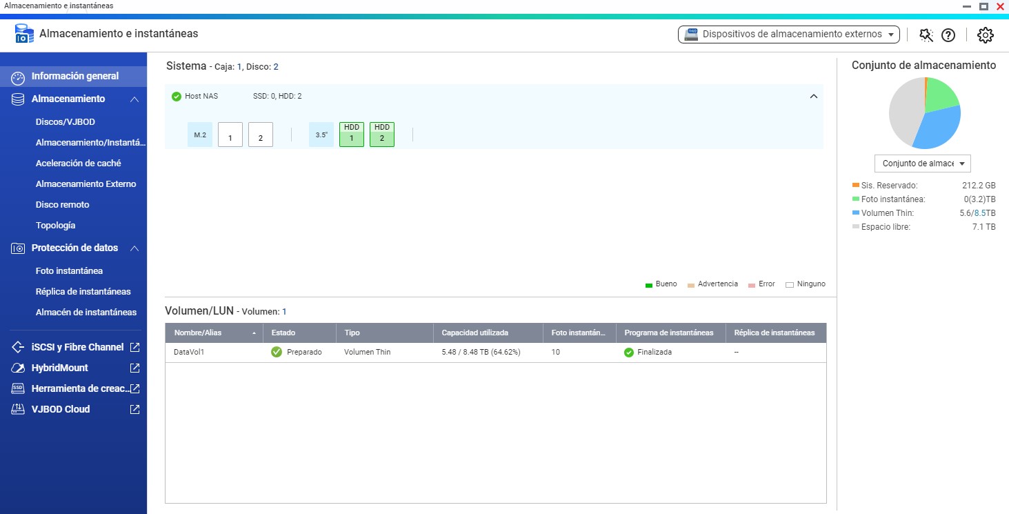 la instalación de ambos discos la he hecho desde el administrador de instantáneas, en una opción que hay para cambiar disco uno por uno. Un día un disco, al siguiente el segundo, y luego de las reconstrucciones respectivas de los raid, al tercer día he procedido a la opción de expandir la capacidad, y aquí es donde me surge el problema. El Nas me reconoce los dos discos de 10TB (9,09tb en sistema de medida de QTS), por otro lado está todo en su sitio, mis fotos, mis archivos, películas, todo como estaba, pero la capacidad de almacenamiento solo me llega después de expandir el conjunto a 7,35 Tb.