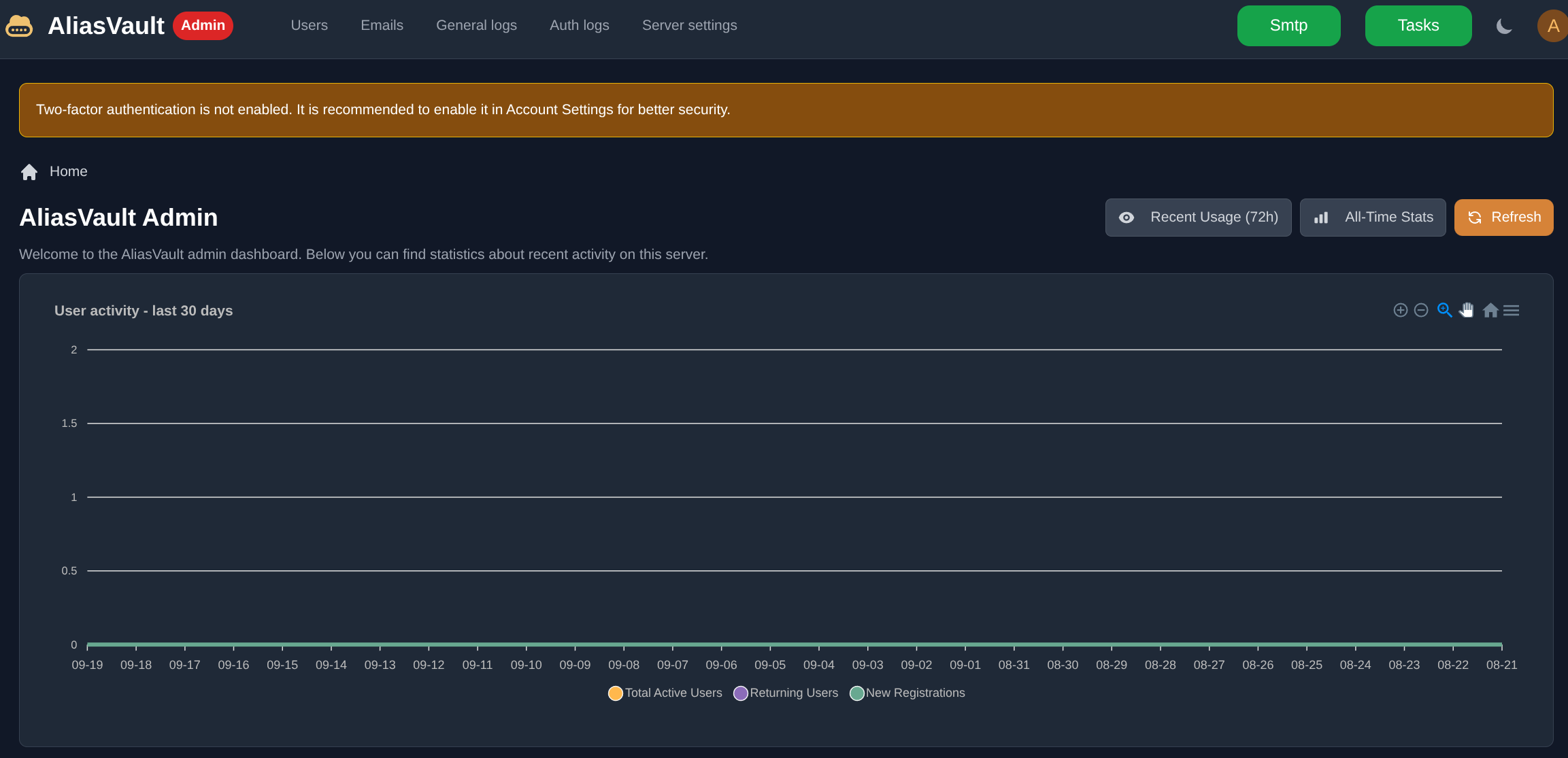 Vamos a empezar accediendo a la configuración de AliasVault, en mi caso he escogido la versión mini del compose de instalación así que para acceder a su interfaz lo hago a través de https://iplocaldelnas:8449/admin