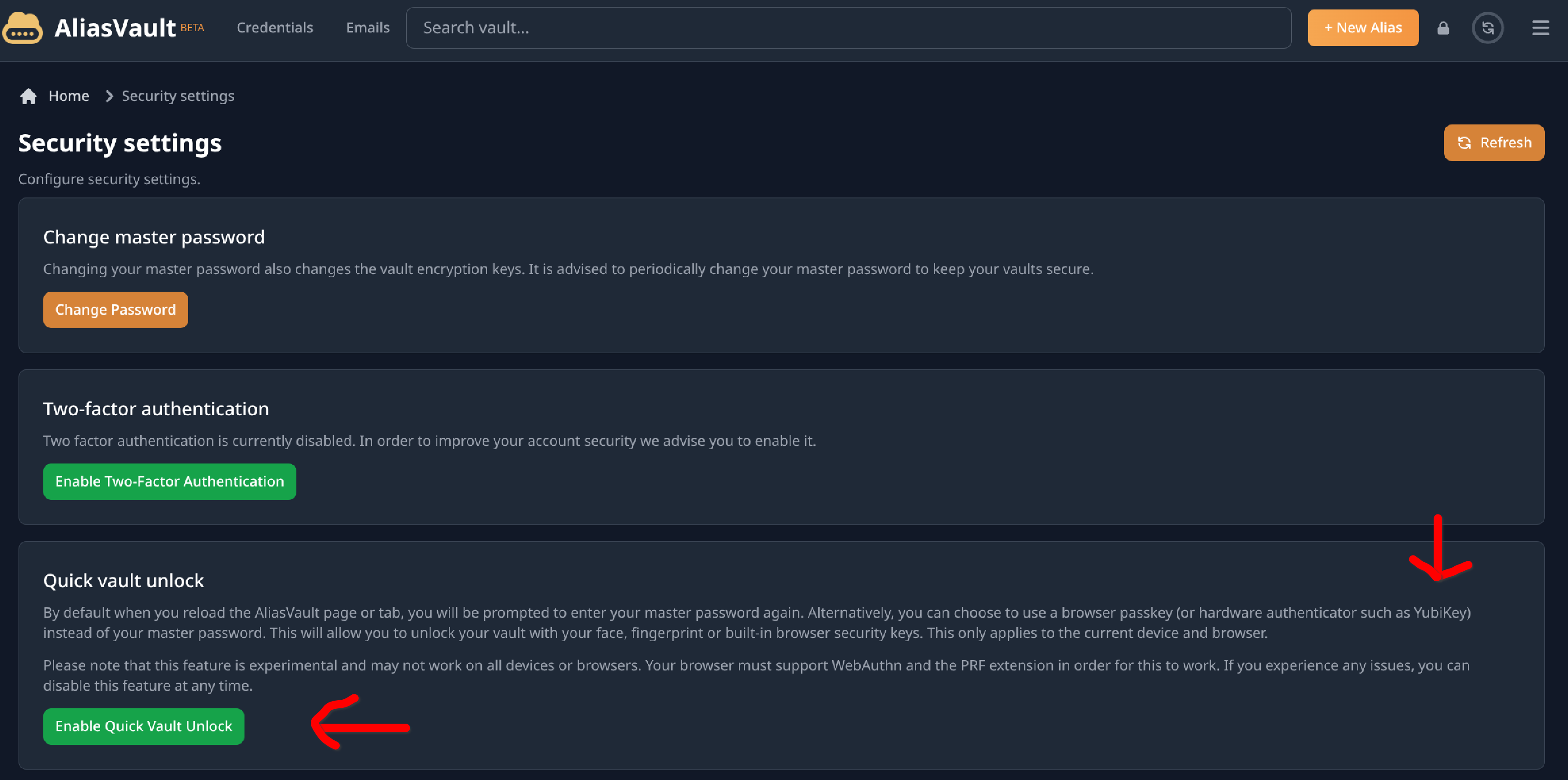 AliasVault tiene todo lo que se le puede pedir a un buen gestor de contraseñas, funciona en local, admite 2FA, yubikey, generador de contraseñas, extensiones para los navegadores y aplicaciones tanto para IOS como para Android y junto a todo esto una interfaz de lo más cuidada.
