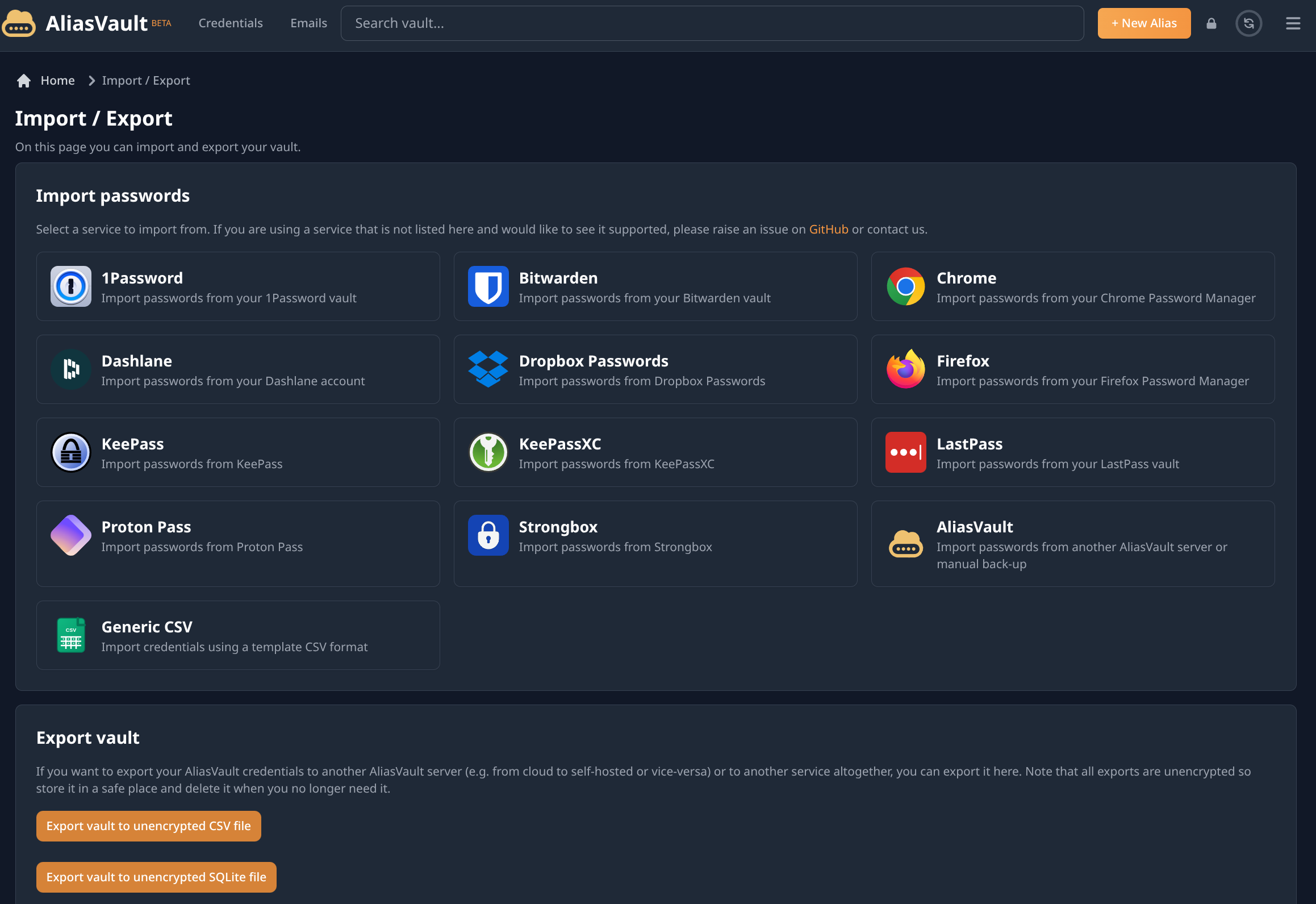 Podemos importar las contraseñas administradas por otros gestores de contraseñas que tengamos y también tenemos la posibilidad de exportar posteriórmente las contraseñas que tengamos en AliasVault.