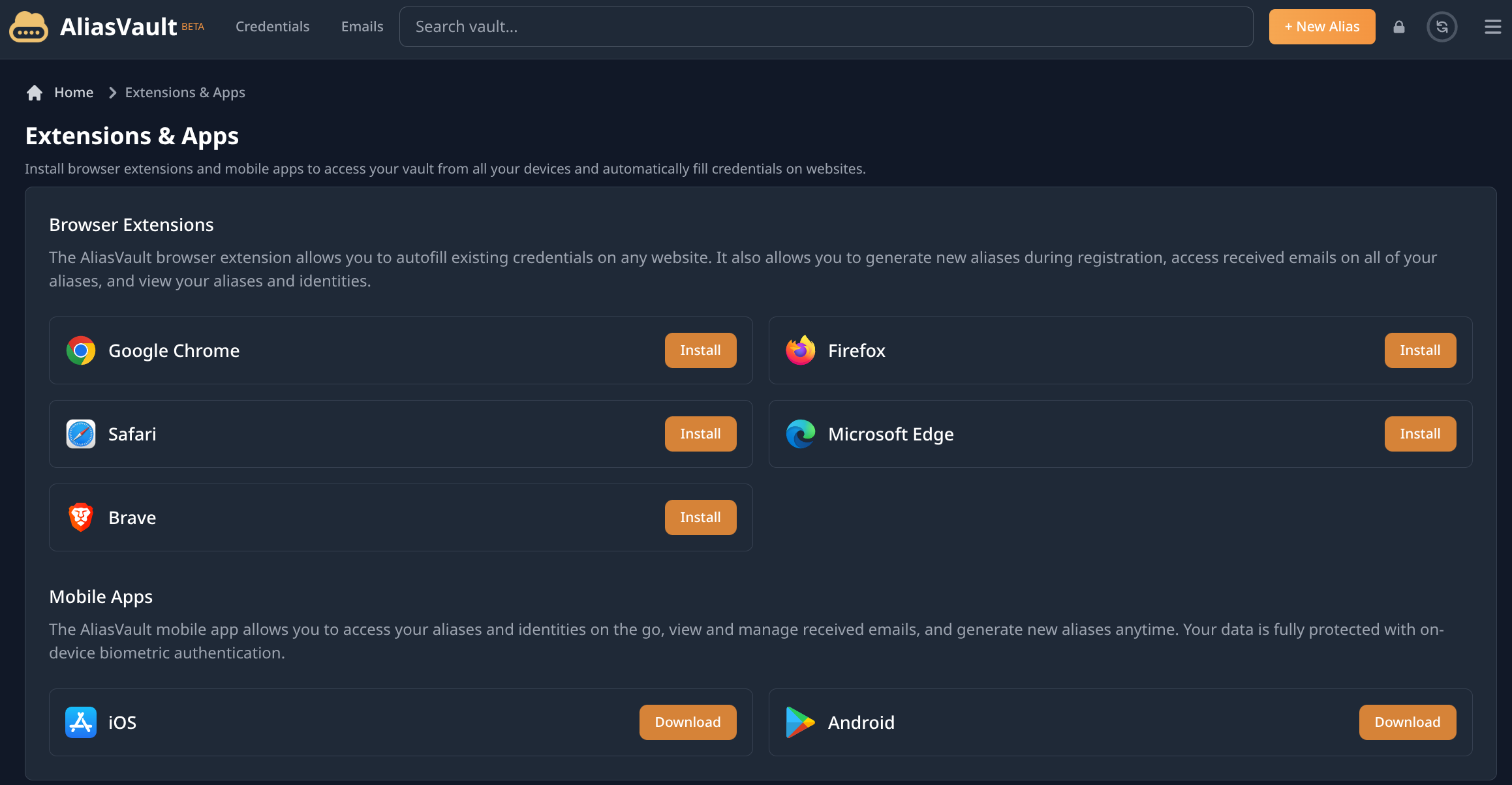 También se nos propone instalar extensiones de AliasVault disponibles para todos los navegadores principales, asimismo también podemos instalar AliasVault en dispositivos móviles tanto en IOS como en Android.