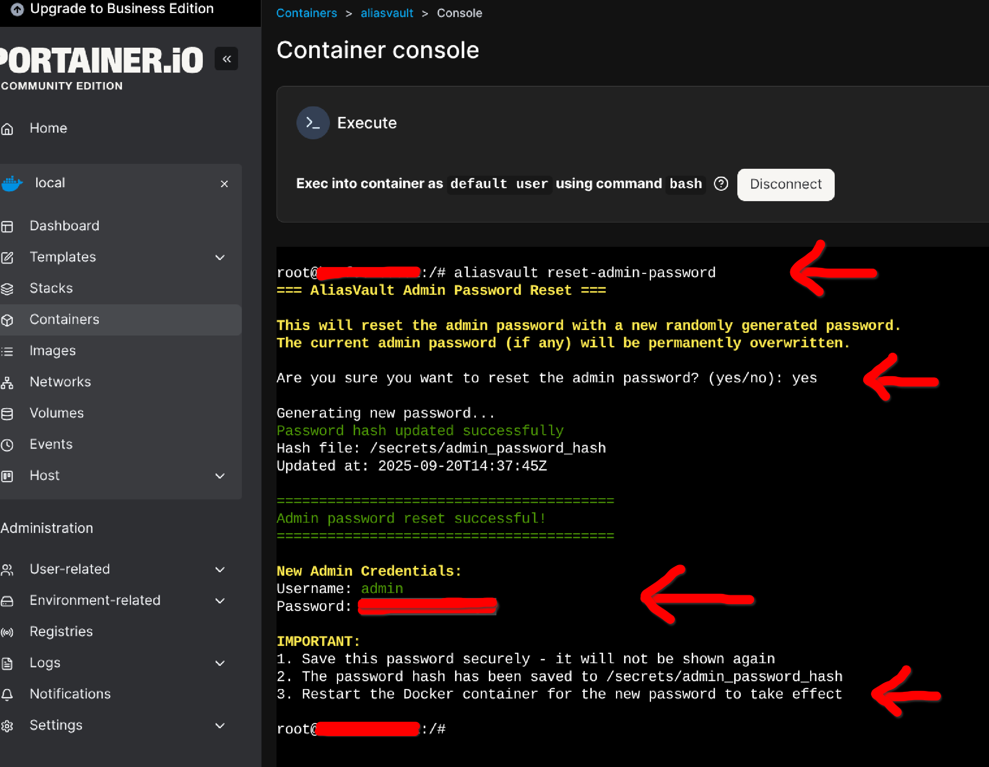 De todo lo que aparece nos interesa ver que se nos informa que el usuario Admin y sobretodo su contraseña no está configurado por defecto y se nos propone unos comandos para solucionarlo. El siguiente paso consiste en acceder a la consola del contenedor AliasVault desde Portainer y ejecutar el siguiente comando: