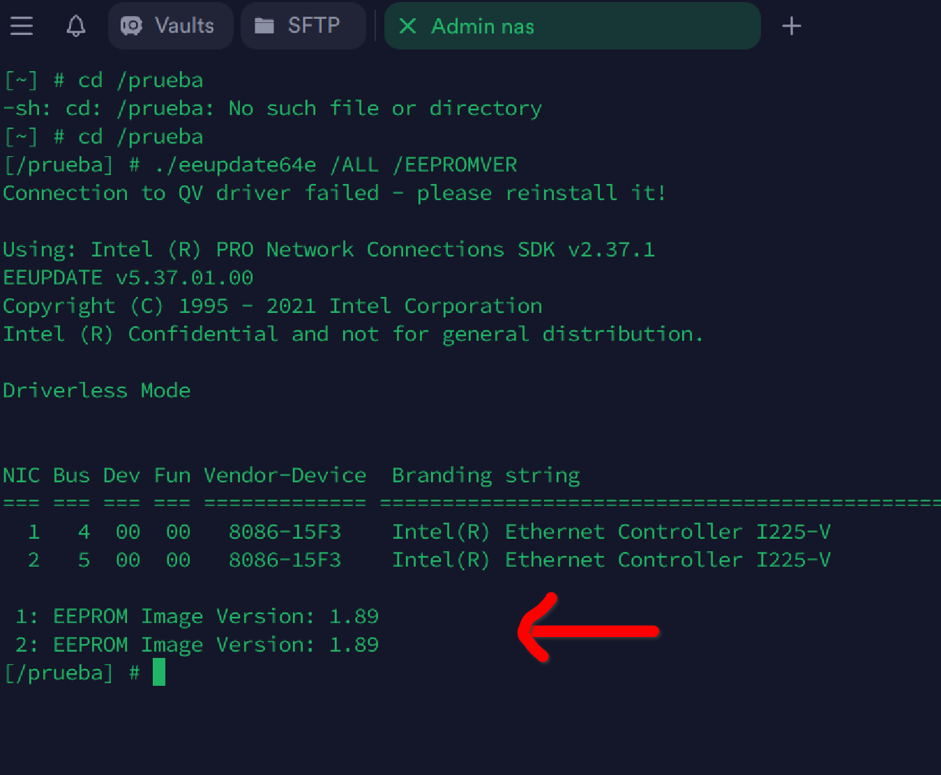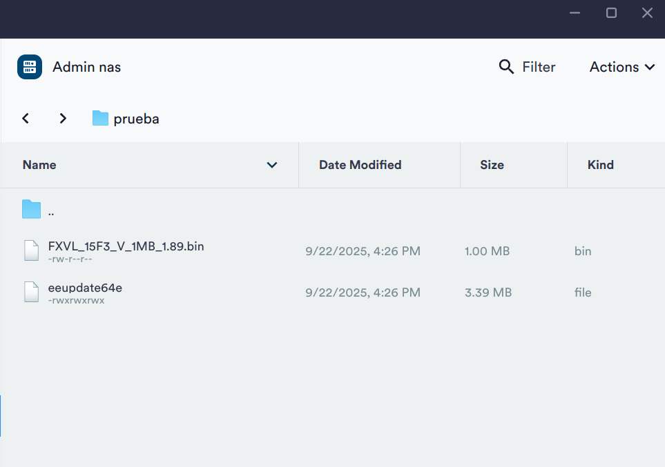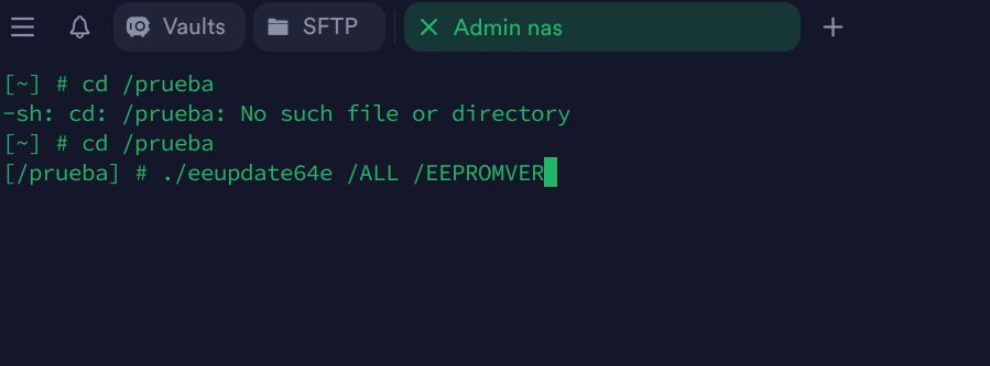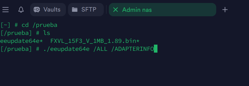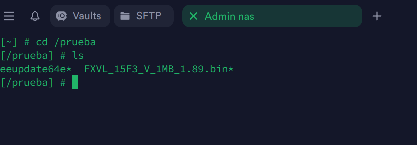 En fin, cosas que pasan, he vuelto a meter la carpeta prueba otra vez al nas por SSH para poder ejecutar el archivo eeupdate64e para hacer la comprobación.