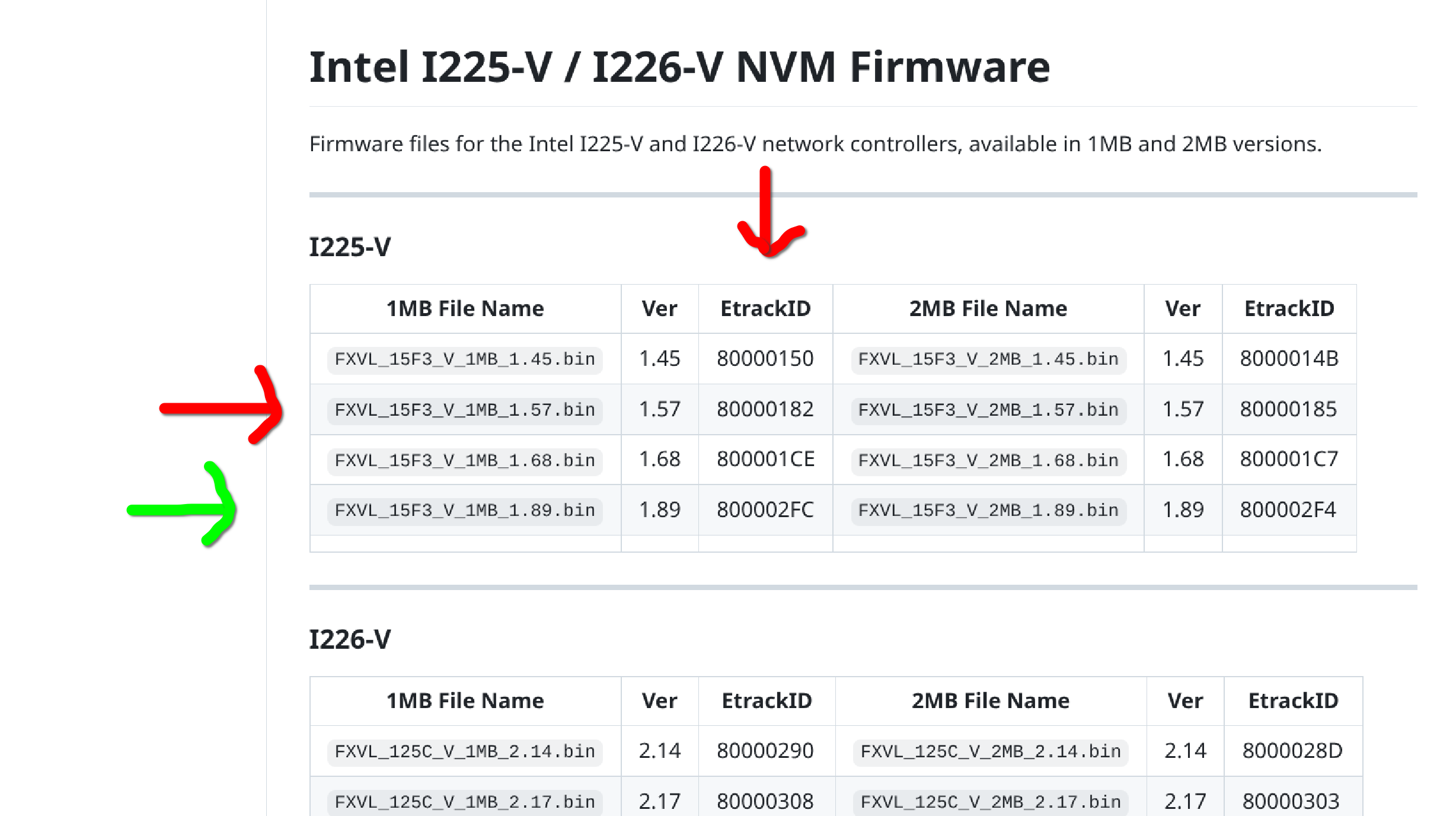 Tanto para el I-225V como para el I-226V hay firmware de 1MB y de 2MB y para saber cual es el que se corresponde a nuestro equipo nos tenemos que fijar en el múmero EtrackID y en mi caso se corresponde al de 1MB
