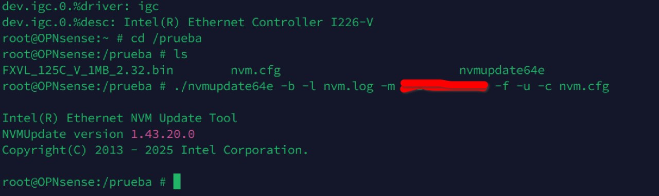 También al principio comenté que este método de flasheo es, con algunos matices, universal. En el caso de mi minipc con el chip I-226V en el que tengo instalado Opnsense ( FreeBSD ) no sólo se utilizan otros comandos para flashear sino que también en lugar de utilizar el archivo eeupdate64e de este tutorial se utiliza otro archivo de nombre nvmupdate64e