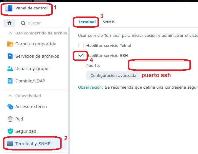 1-habilito ssh en la Synology para poder acceder desde la QNAP y poder usar la consola