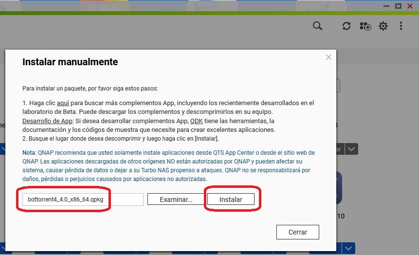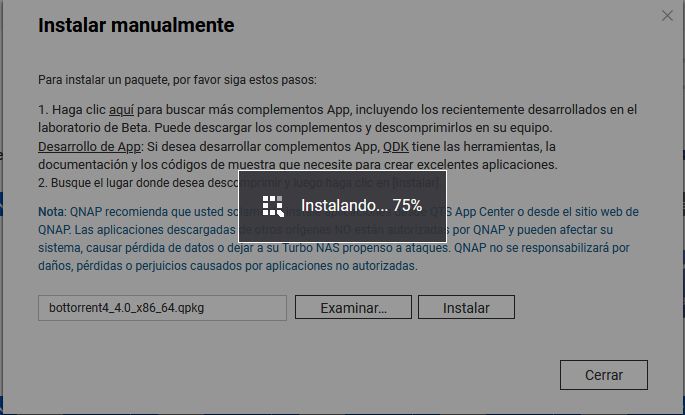 Luego descargamos el archivo bottorrent4_4.1_x86_64.qpkg que bajamos desde Mega y lo instalaremos.