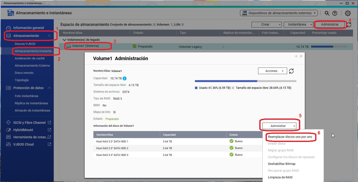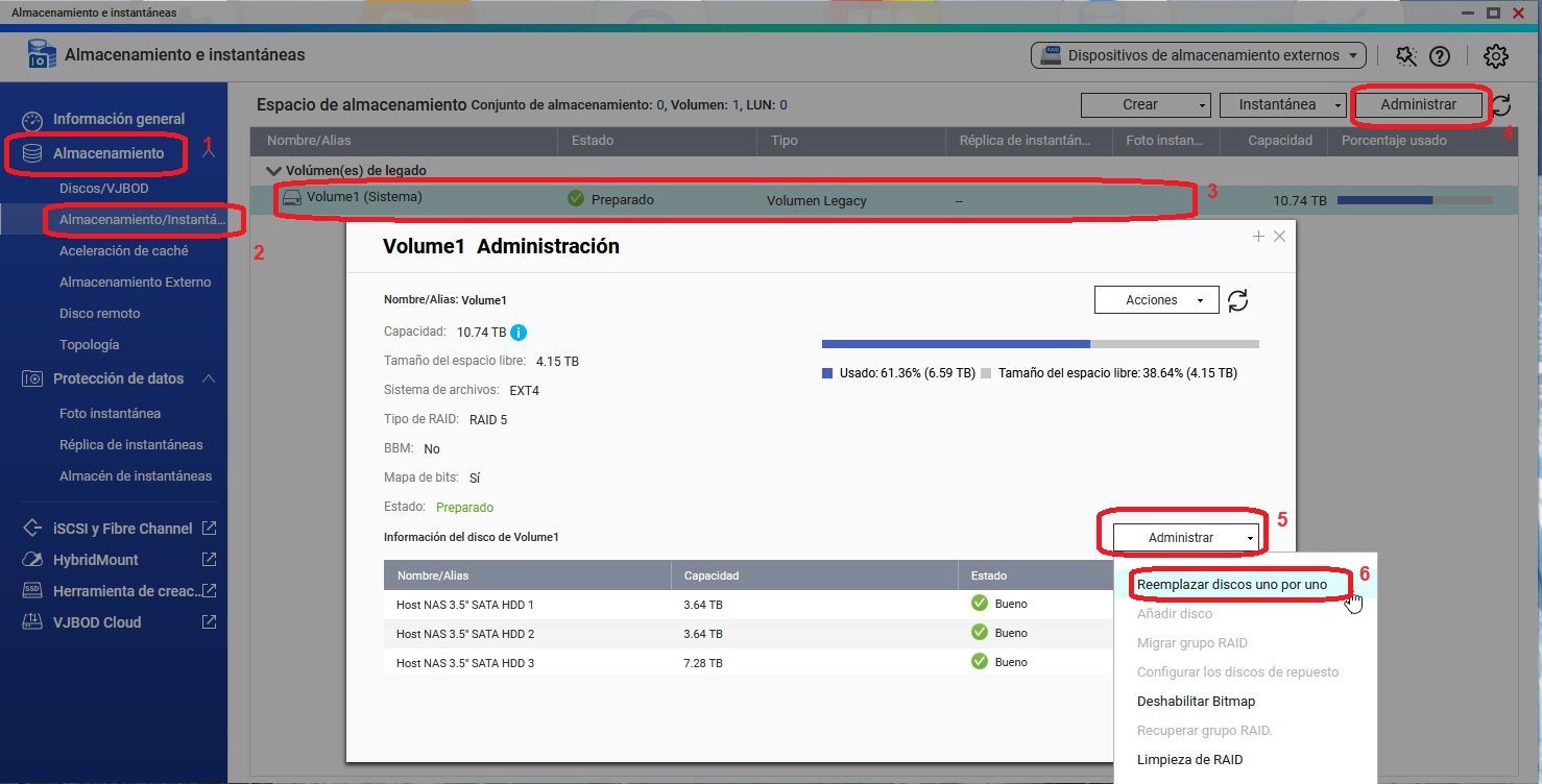 Pulsamos sobe "almacenamiento", "Almacenamiento/instantáneas", seleccionamos el volumen adecuado, pulsamos sobre el botón de "Administrar". En la nueva ventana que se abre, pulsamos de nuevo "Administrar" y elegimos "Reemplazar discos uno por uno"