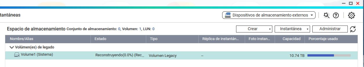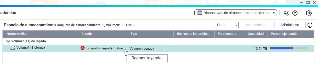 Un poco mas tarde, tras preparar de forma automática y transparente las particiones de QTS comenzará con la integración de ese disco en el raid y la reconstrucción del mismo.