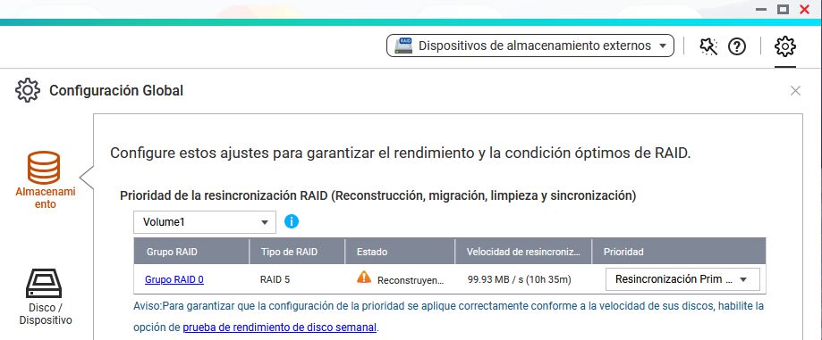 Aquí podemos elegir la velocidad de reconstrucción del raid vs prestaciones de la nas.