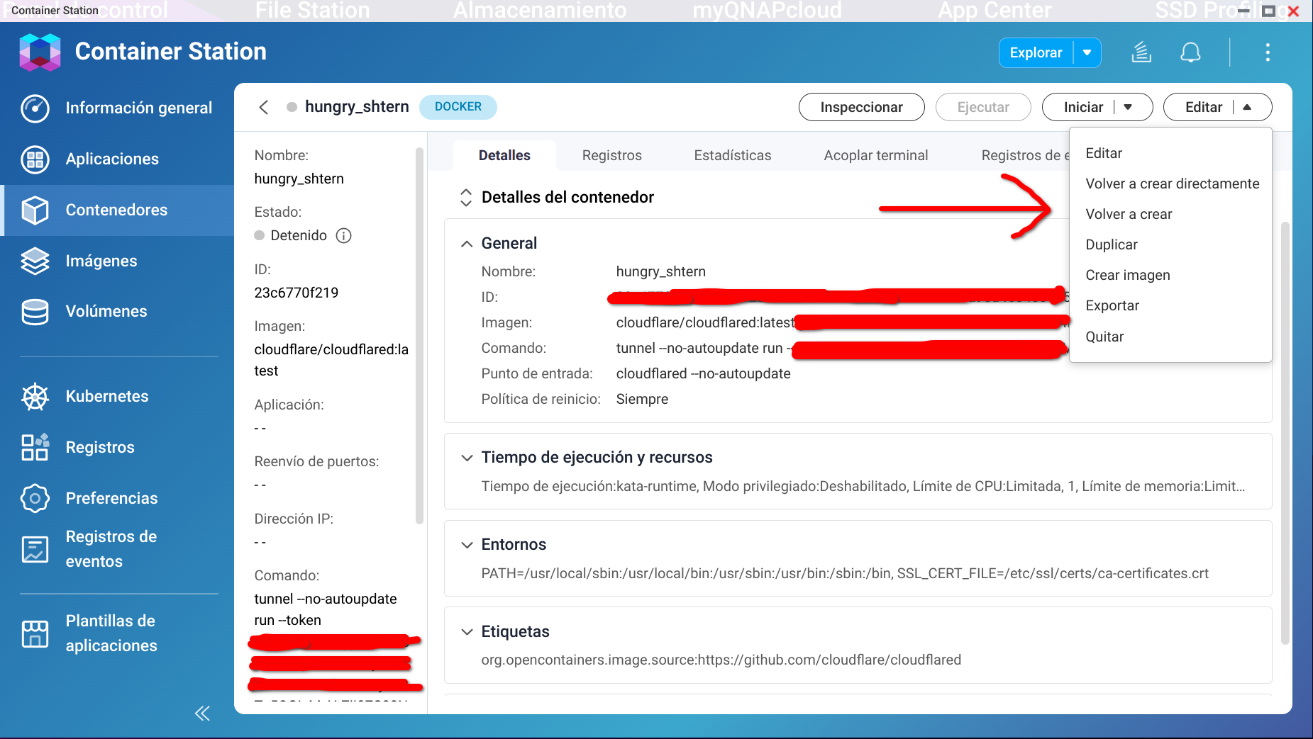 Una vez escogido el contenedor que tenemos instalado en el nas para convertirlo a Kata Contenedor en Container Station lo paramos. Una vez detenido lo vamos a Editar volviéndolo a crear: