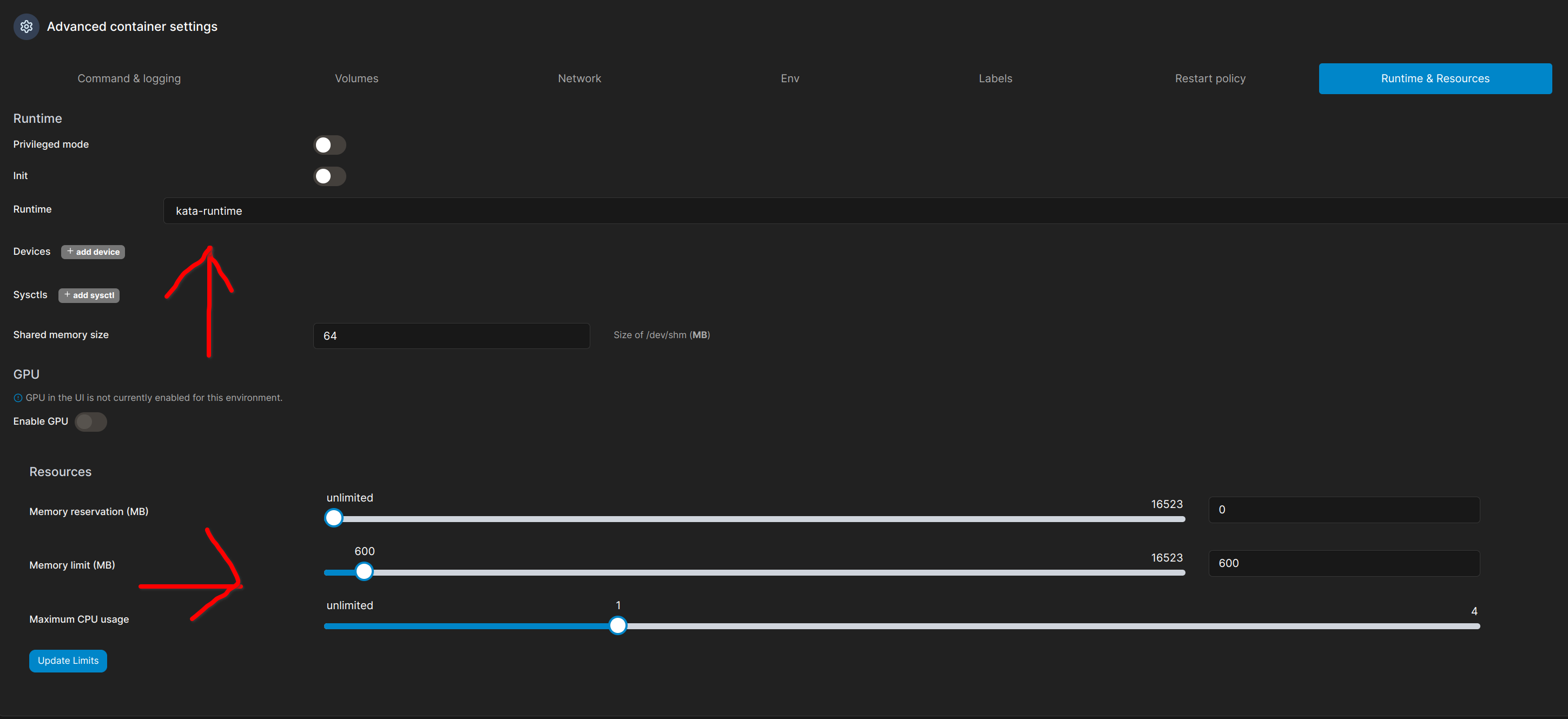 En el apartado avanzado Runtime & Resources cambiamos el runtime por defecto runc por kata-runtime
