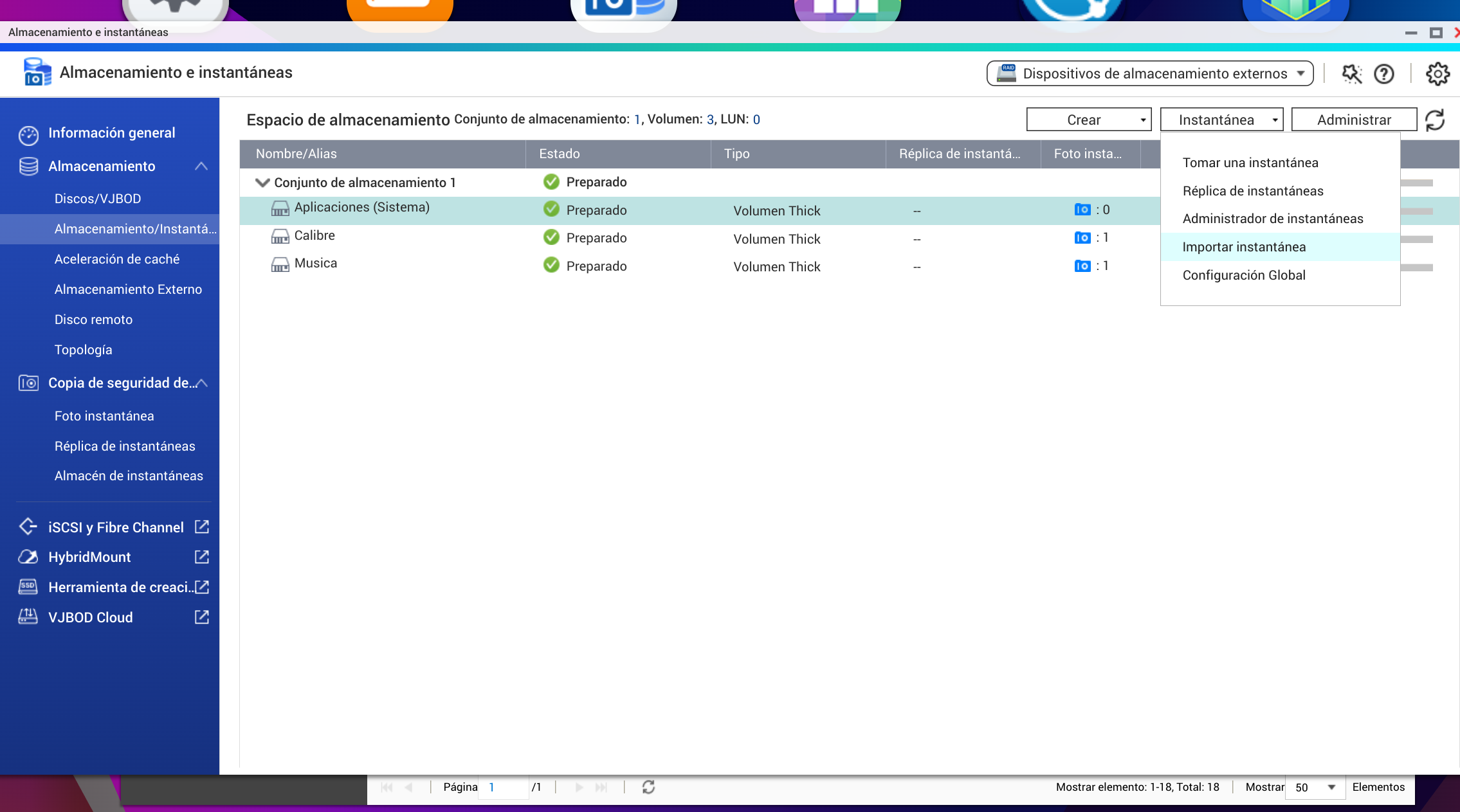 Hasta hoy mismo tenía en mi nas las instantáneas deshabilitadas así que para crear este tutorial las he activado. Mi nas tiene 3 volúmenes creados y he creado una instantánea por cada Volumen. A la hora de hacer la copia externa de la instantánea he hecho la prueba con la de mi primer Volumen que es el que Qnap considera de Sistema y es en el que están las aplicaciones del nas. Para hacer la copia externa he conectado a mi nas un disco duro externo. Como he dicho antes he creado una instantánea en ese Volumen y procedo a exportarla al disco duro externo conectado al nas: