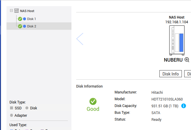 Para consultar la tabla SMART: Almacenamiento e instantáneas > Discos > Condición del disco > Información SMART > Disco 1 / Disco 2