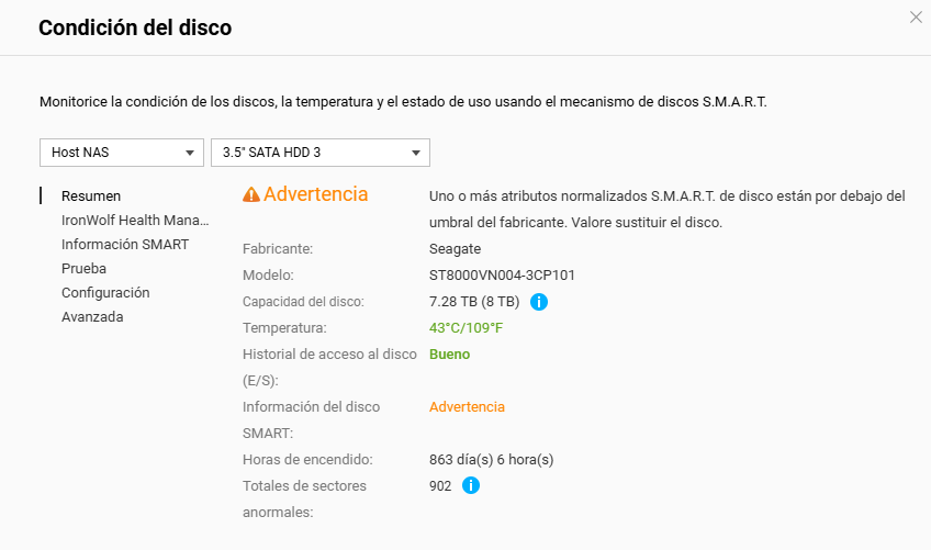 Entiendo que pudiera ser el estado de los discos, pero es realmente confusa la situación, SMART dice que hay errores, IHM dice que todo está perfecto y además el NAS dice que las E/S en los discos están perfectos: