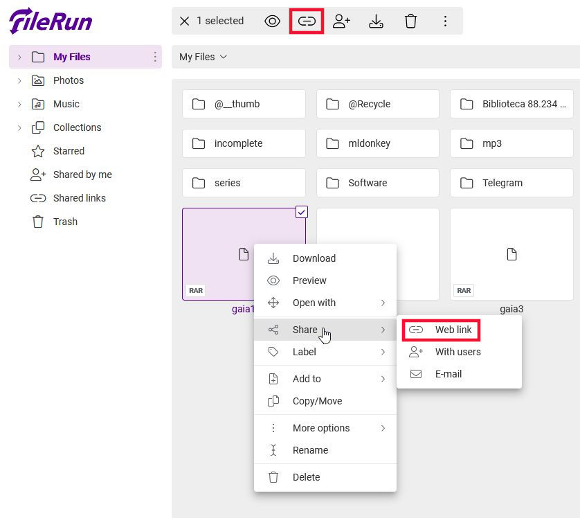 Al hacerlo veremos el enlace de compartición. Si creamos el acceso accediendo a FileRun desde internet mediante el uso de dns, el enlace de compartición será público y funcionará desde fuera de nuestra red