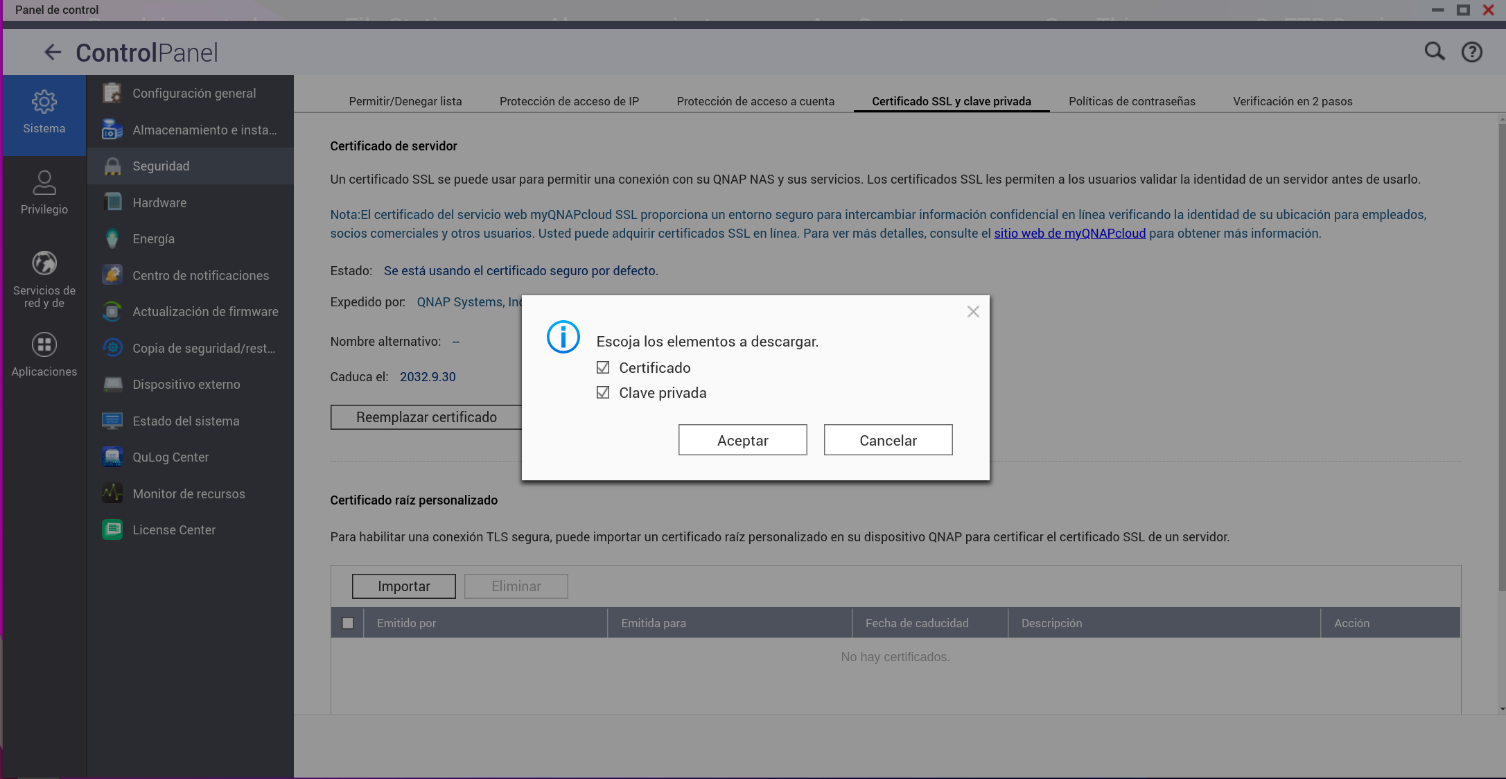 Lo que vamos a hacer es CAMBIARLO por el de Cloudflare. Este proceso se puede revertir sin problemas. Aunque no es necesario si queremos ser precavidos podemos descargar a nuestro ordenador el certificado que tenemos instalado en el nas ANTES de cambiarlo dándole al botón de Descargar certificado: